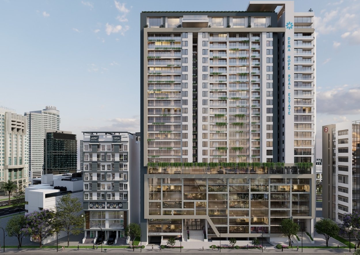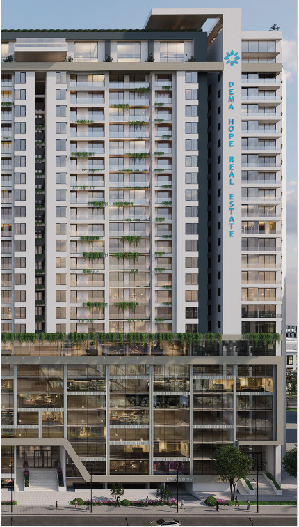 The Dema Hope Bole Adey Ababa project is a mixed-use 2B+G+21 development, combining commercial spaces on the ground to the 4th floor with residential units from the 5th to the 15th floor. It offers flexible commercial spaces from 15 to 200 sqm, and residential units ranging from one-bedroom apartments to three-bedroom units and penthouses with expansive views.